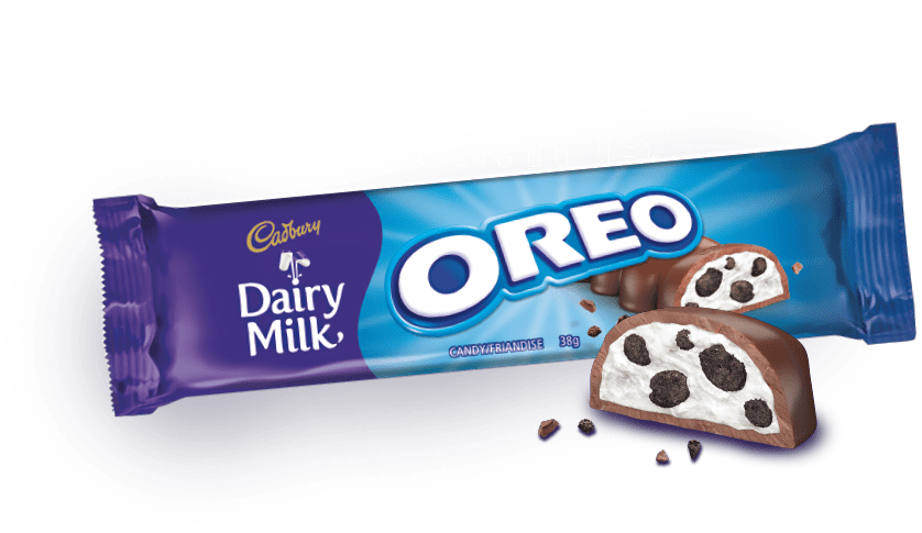 Introducing the Cadbury Dairy Milk Oreo Bar! Delicious Cadbury Dairy Milk on the outside combined with crunchy Oreo cookie bits and smooth vanilla creme on the inside.