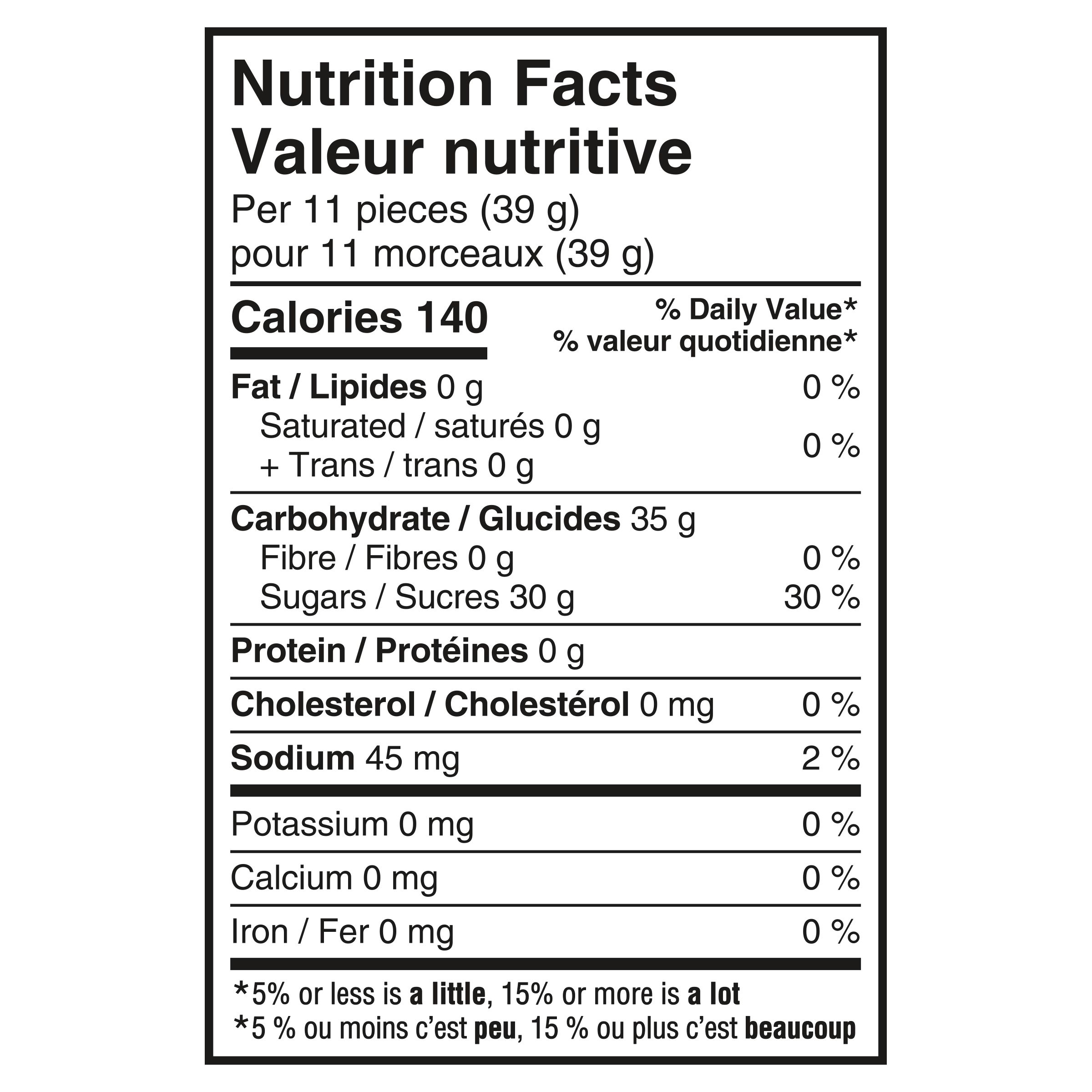 Sugars (sugar, glucose syrup), Modified corn starch, Citric acid, Tartaric acid, Artificial flavour, Titanium dioxide, Allura red, Tartrazine, Brilliant blue FCF.