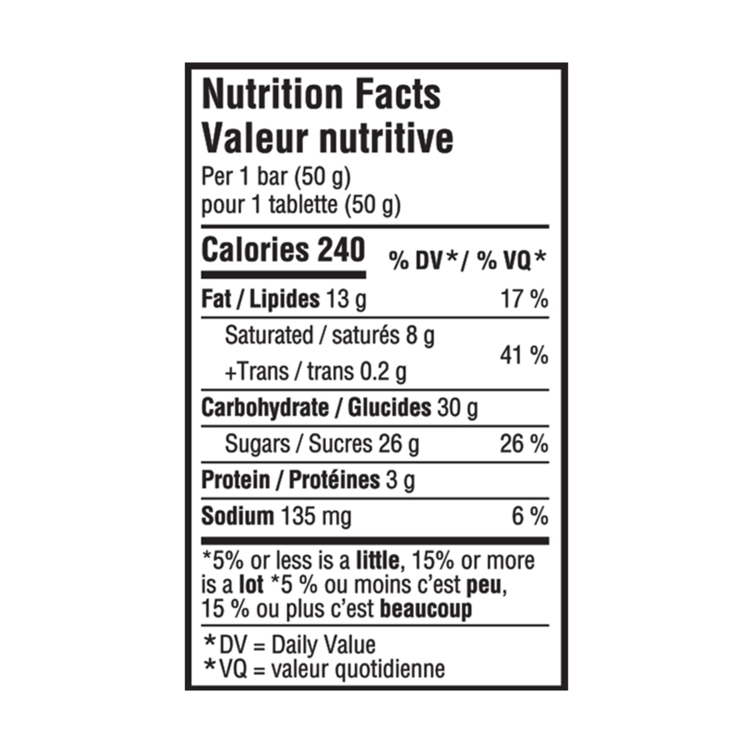 Sugars (sugar, glucose syrup), Milk ingredients, Modified palm oil, Unsweetened chocolate, Modified vegetable oil, Sea salt, Cocoa butter, Salt, Soy lecithin, Baking soda, Calcium chloride, Natural and artificial flavours.Contains: Milk, Soy.May contain: Peanut, Almond, Cashew, Hazelnut.