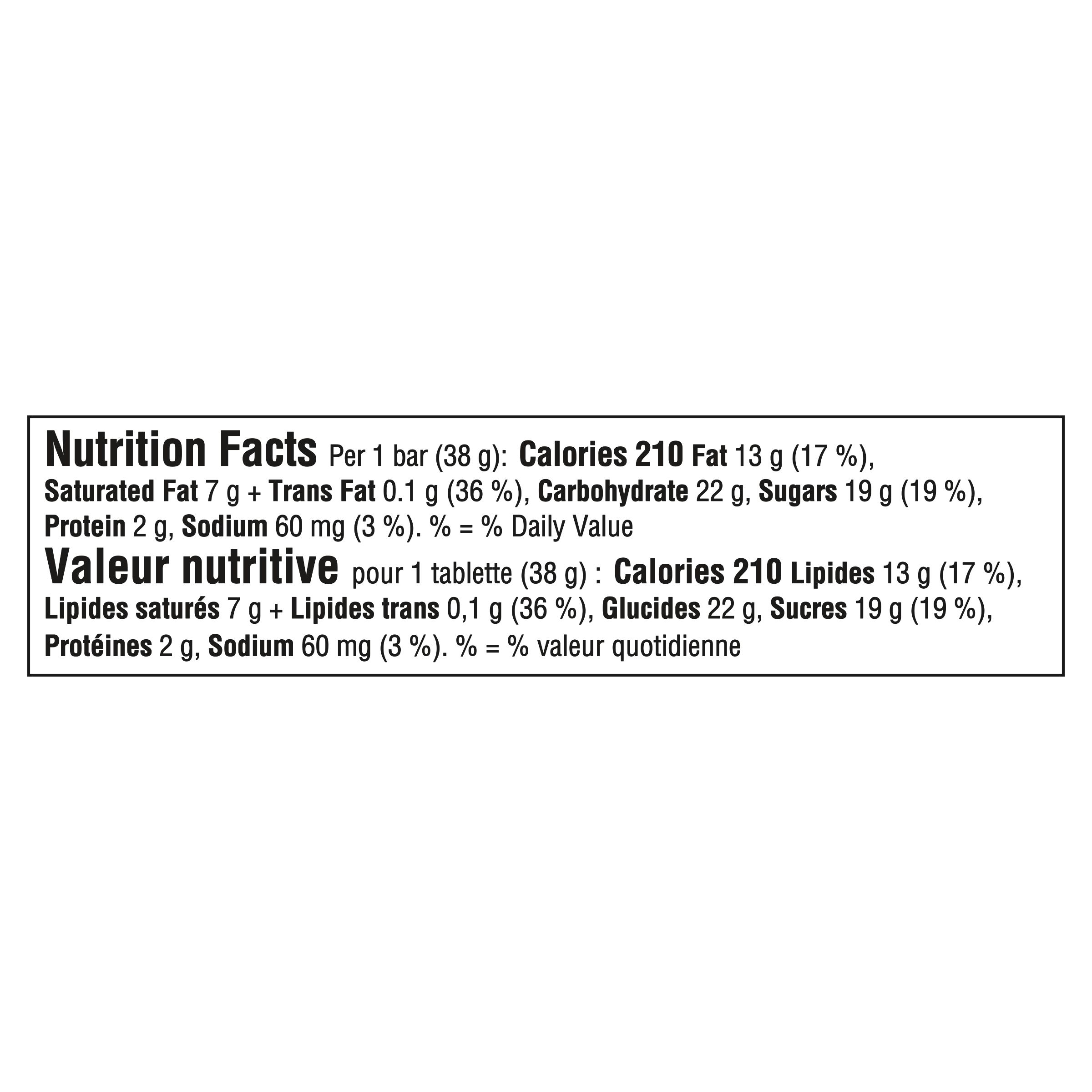 Sugars (sugar, glucose syrup), Modified milk ingredients, Modified palm oil, Wheat flour, Unsweetened chocolate, Cocoa butter, Modified vegetable oil, Cocoa, Salt, Ammonium phosphatides, Polyglycerol polyricinoleate, Soy lecithin, Ammonium bicarbonate, Baking soda, Artificial flavour. Contains: Milk, Wheat, Soy. May contain: Tree nuts.