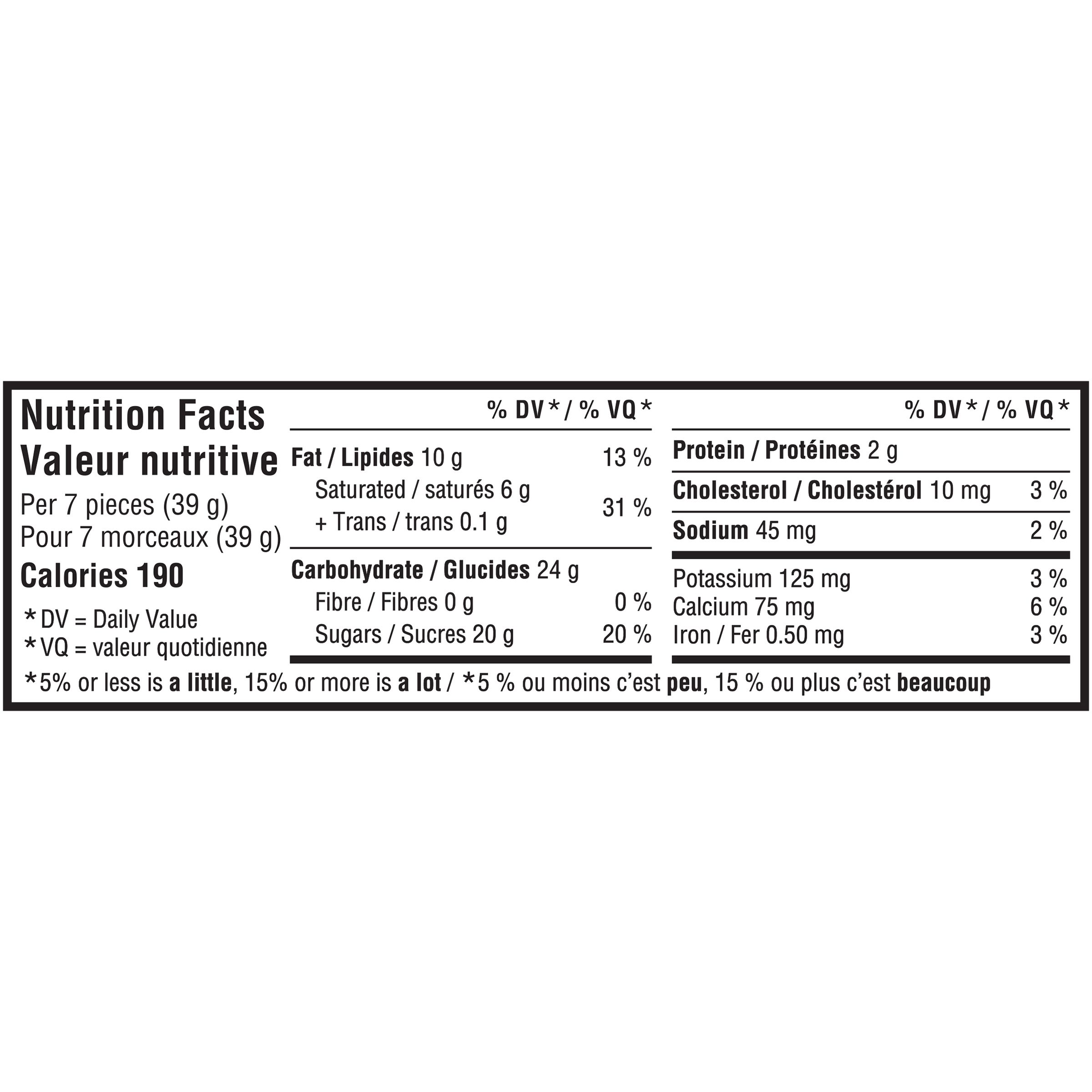 Sugars (sugar, glucose syrup), Milk ingredients, Modified palm oil, Unsweetened chocolate, Modified vegetable oil, Cocoa butter, Salt, Soy lecithin, Baking soda, Calcium chloride, Natural and artificial flavours. Contains: Milk, Soy. May contain: Peanut, Almond, Cashew, Hazelnut.
