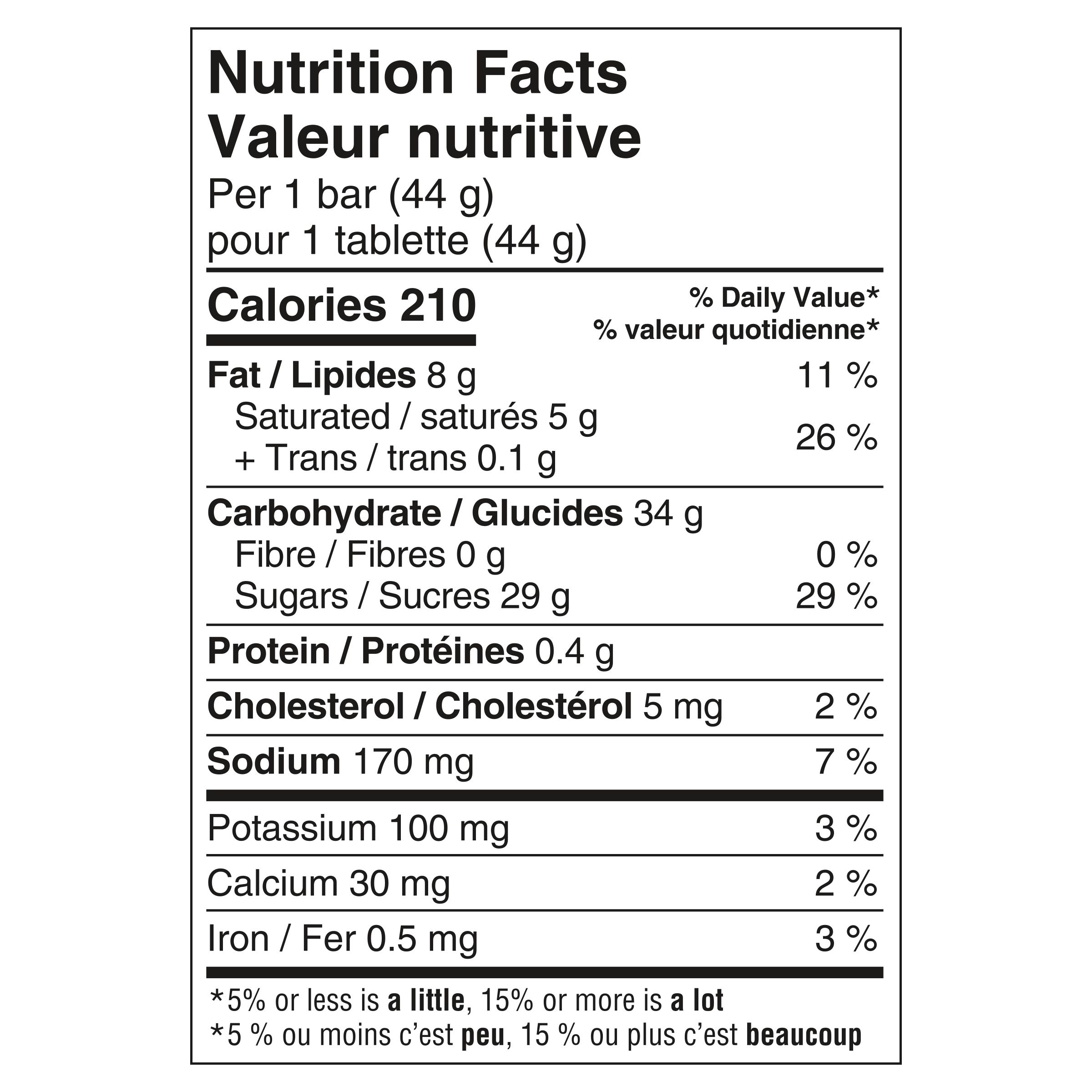 Sugars (sugar, glucose syrup), Modified palm oil, Modified milk ingredients, Modified vegetable oil, Cocoa, Unsweetened chocolate, Salt, Baking soda, Soy lecithin, Calcium chloride, Natural and artificial flavour. Contains: Milk, Soy. May contain: Peanut, Tree nuts.