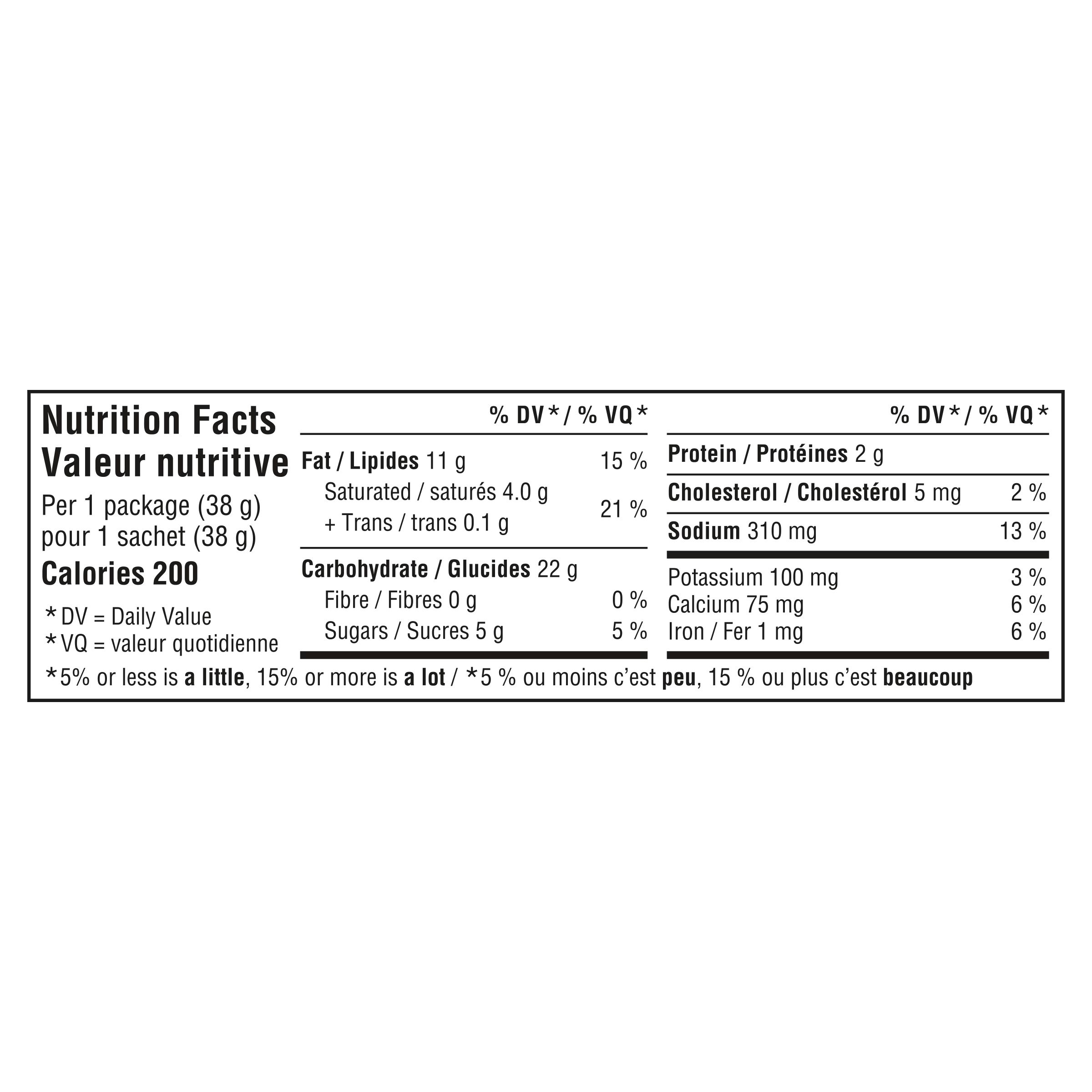 Wheat flour, Shortening (vegetable oil, modified palm oil), Modified milk ingredients, Palm oil shortening, Corn starch, Sugars (sugar, glucose-fructose), Salt, Monocalcium phosphate, Baking soda, Soy lecithin, Sodium phosphate, Lactic acid, Tricalcium phosphate, Vegetable oil, Bacterial culture, Microbial enzyme, Papain, Amylase, Protease, Natural flavour, Turmeric extract, Annatto extract. Contains: Wheat, Milk, Soy. May contain: Peanut.