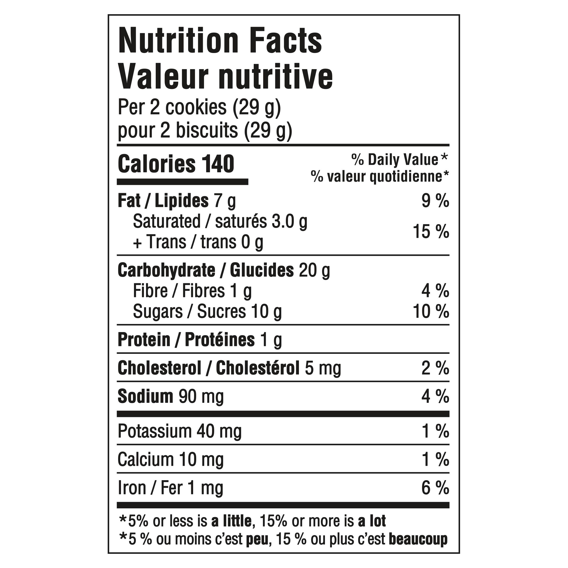 Wheat flour, Confectionery drops (sugar, hydrogenated palm kernel oil, modified milk ingredients, cocoa, soy lecithin, natural and artificial flavour, acacia gum, titanium dioxide, brilliant blue FCF, tartrazine, allura red), Sugars (sugar and/or golden sugar, glucose-fructose), Shortening (vegetable oil, modified palm oil), Semi-sweet chocolate chips (sugar, unsweetened chocolate, cocoa butter, dextrose, milk ingredients, soy lecithin), Salt, Baking soda, Ammonium phosphate, Ammonium bicarbonate, Artificial flavour, Caramel colour. Contains: Wheat, Milk, Soy.