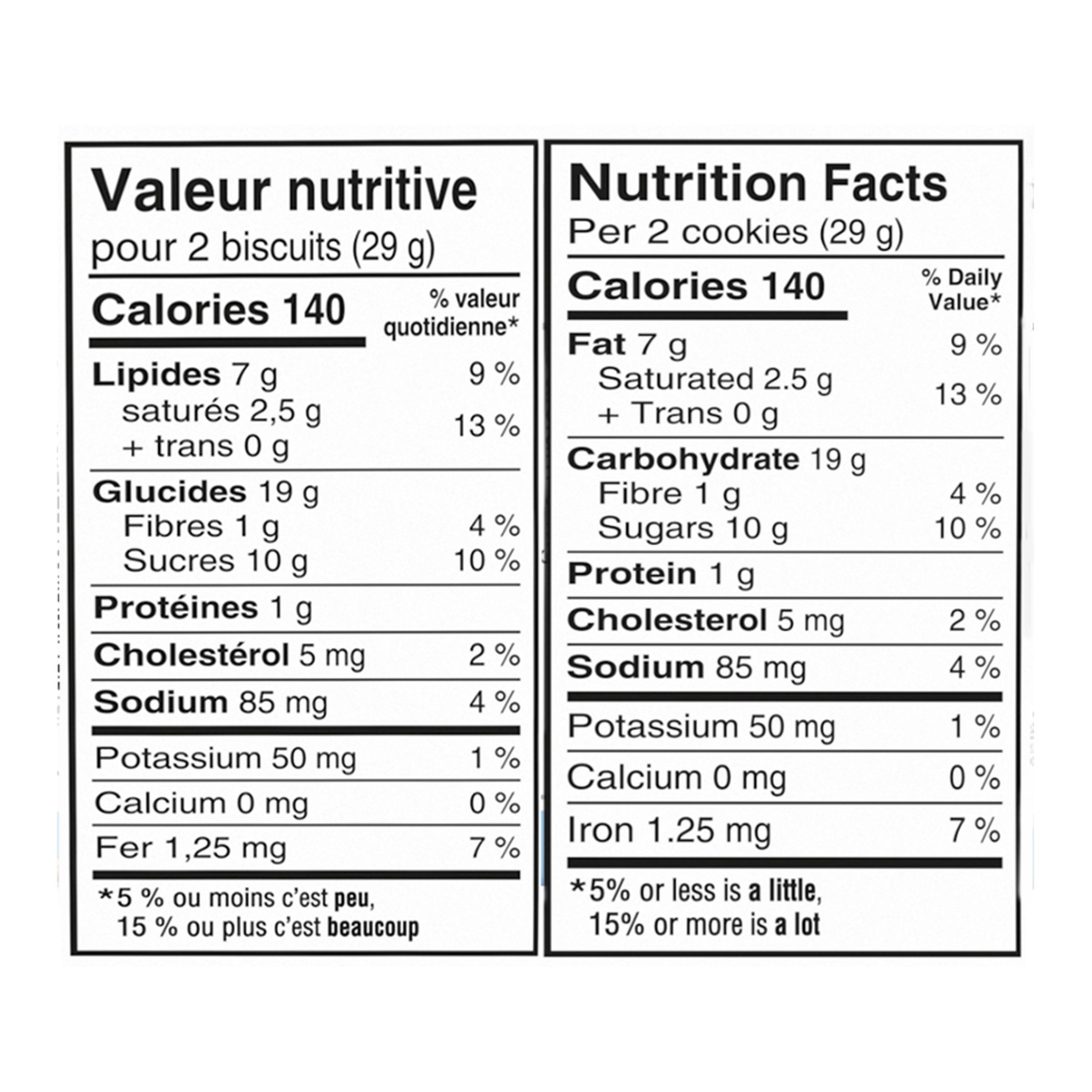 Wheat flour, Semi-sweet chocolate chips (sugar, unsweetened chocolate, cocoa butter, dextrose, milk ingredients, soy lecithin), Sugars (sugar and/or golden sugar, glucose-fructose), Shortening (vegetable oil, modified palm oil), Salt, Baking soda, Ammonium phosphate, Ammonium bicarbonate, Artificial flavour, Caramel colour. Contains: Wheat, Milk, Soy.
