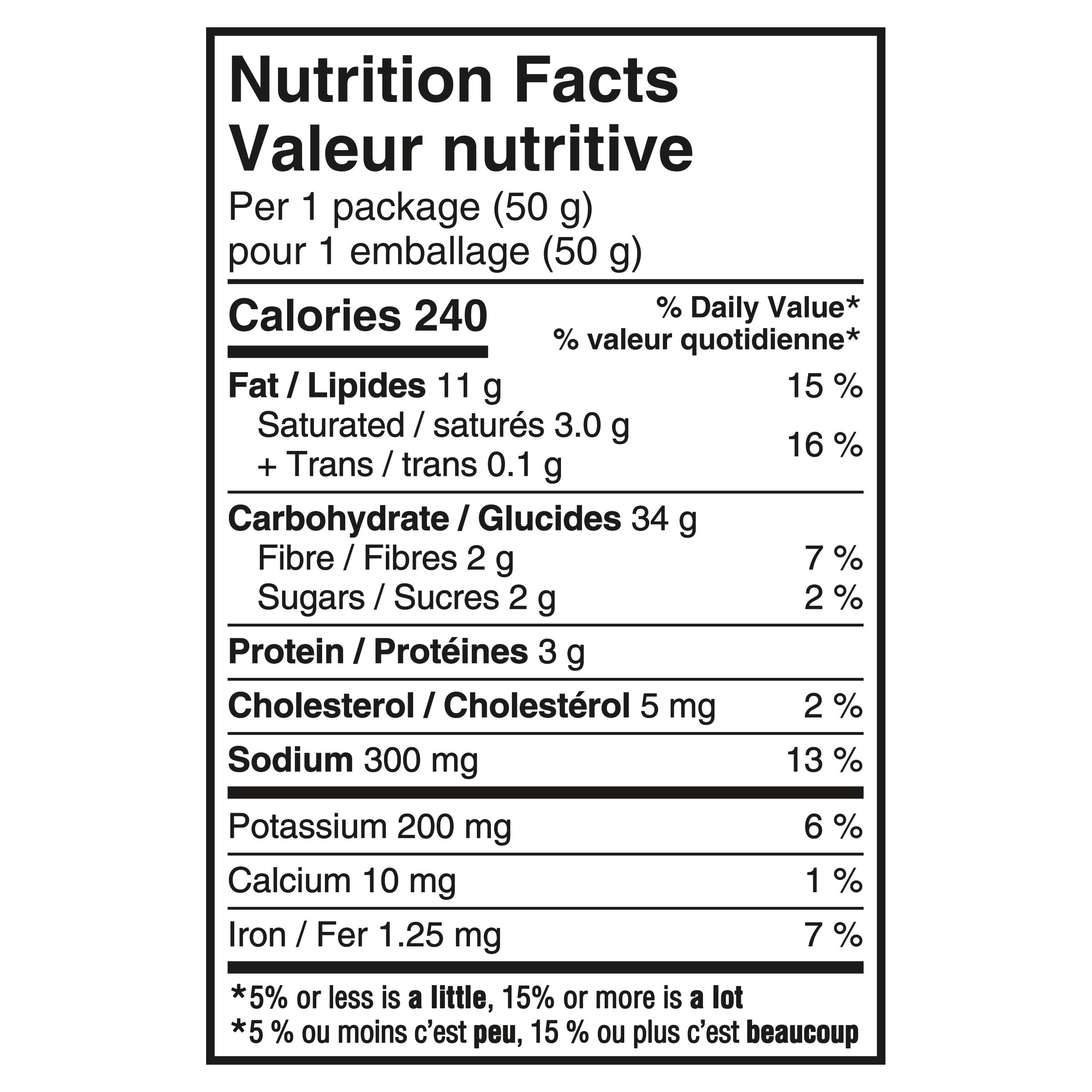 Wheat flour, Potato flour (potatoes, mono- and diglycerides, citric acid), Shortening (vegetable oil, modified palm oil), Modified corn starch, Seasoning (sugar, salt, sodium diacetate, glucose solids, corn starch, yeast, monosodium glutamate, sodium acetate, spices, autolyzed yeast extract, garlic powder, onion powder, natural flavour, citric acid, vegetable oil, paprika extract), Sugars (glucose-fructose, sugar), Modified potato starch, Wheat bran, Monosodium glutamate, Malted barley flour, Baking soda, Salt, Soy lecithin, Sulfites, Annatto extract, Caramel colour.Contains: Wheat, Barley, Soy, Sulfites.
