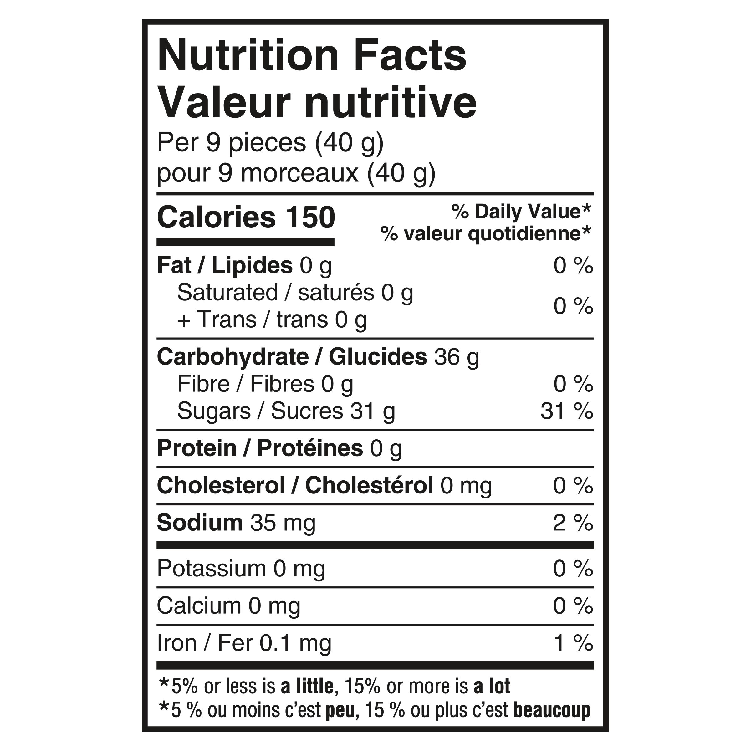 : Sucres (sucre, sirop de glucose), Amidon de maïs modifié, Acide citrique, Acide tartrique, Arôme artificiel, Tartrazine, Rouge allura.