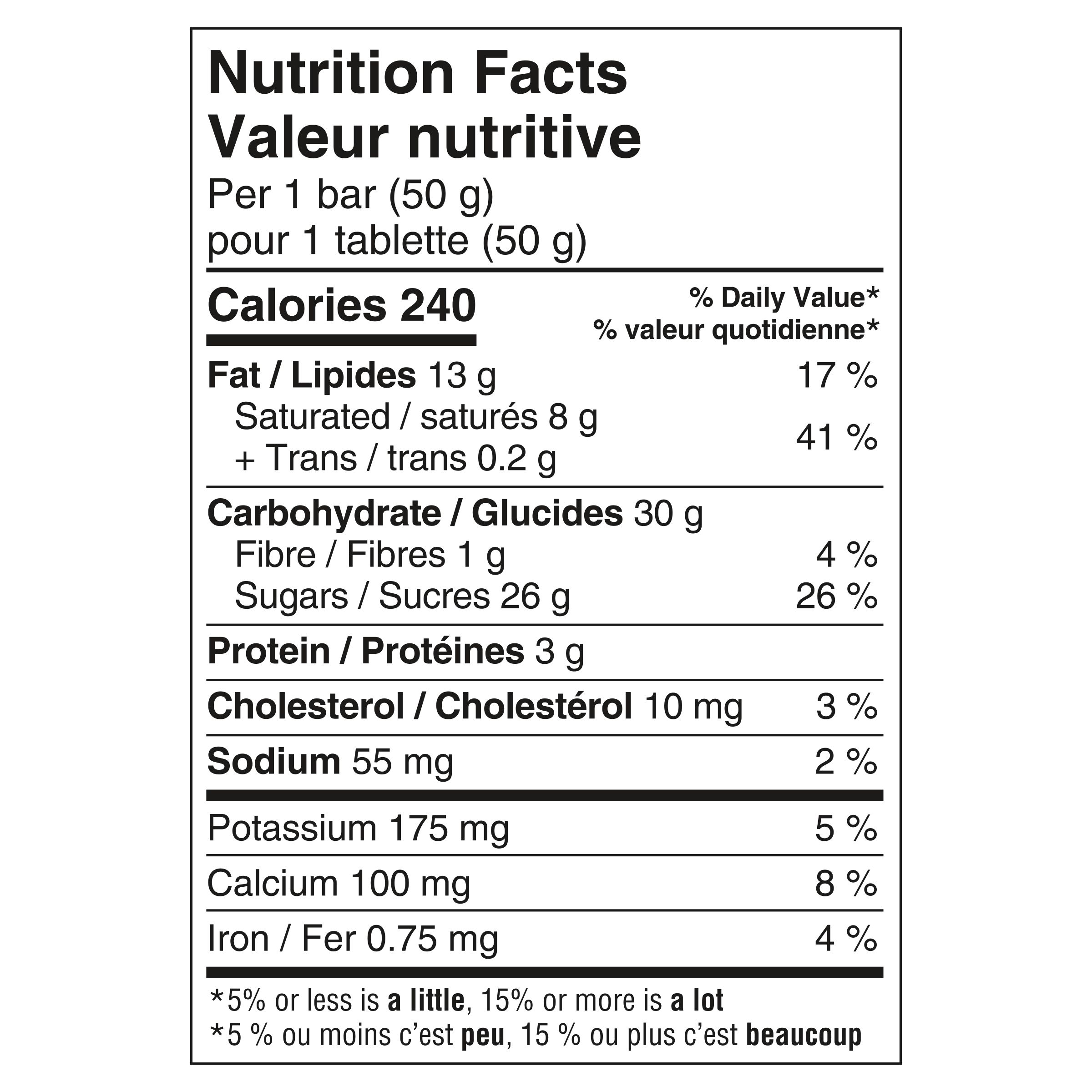 : Sucres (sucre, sirop de glucose), Substances laitières, Huile de palme modifiée, Chocolat non sucré, Huile de palme, Huile végétale modifiée, Beurre de cacao, Sel, Lécithine de soja, Bicarbonate de sodium, Chlorure de calcium, Arômes naturels et artificiels .Contient : Lait, Soja. Peut contenir : Arachides, Noix.