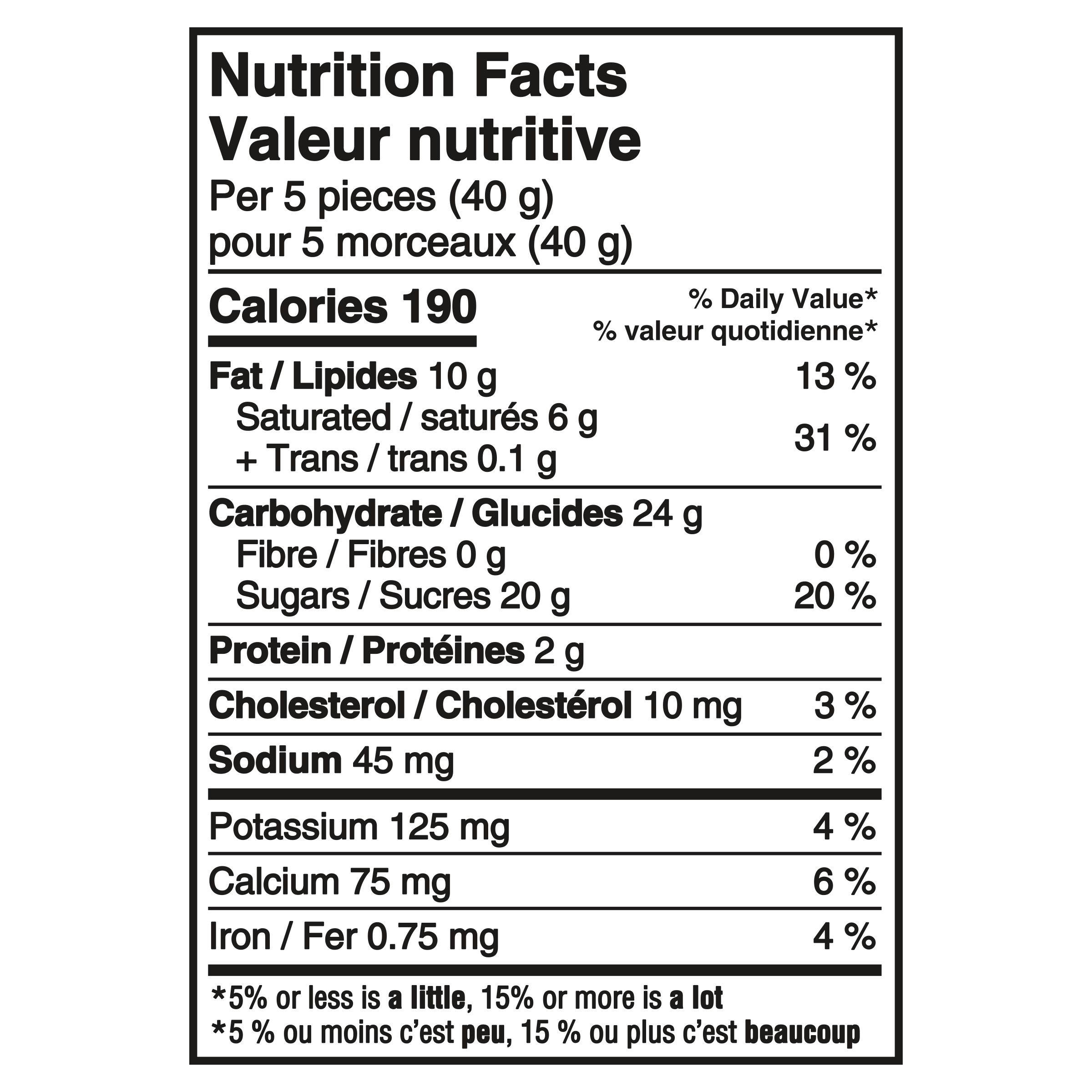 : Sucres (sucre, sirop de glucose), Substances laitières, Huile de palme modifiée, Chocolat non sucré, Huile de palme, Huile végétale modifiée, Beurre de cacao, Sel, Lécithine de soja, Bicarbonate de sodium, Chlorure de calcium, Arômes naturels et artificiels. Contient : Lait, Soja. Peut contenir : Arachides, Noix.