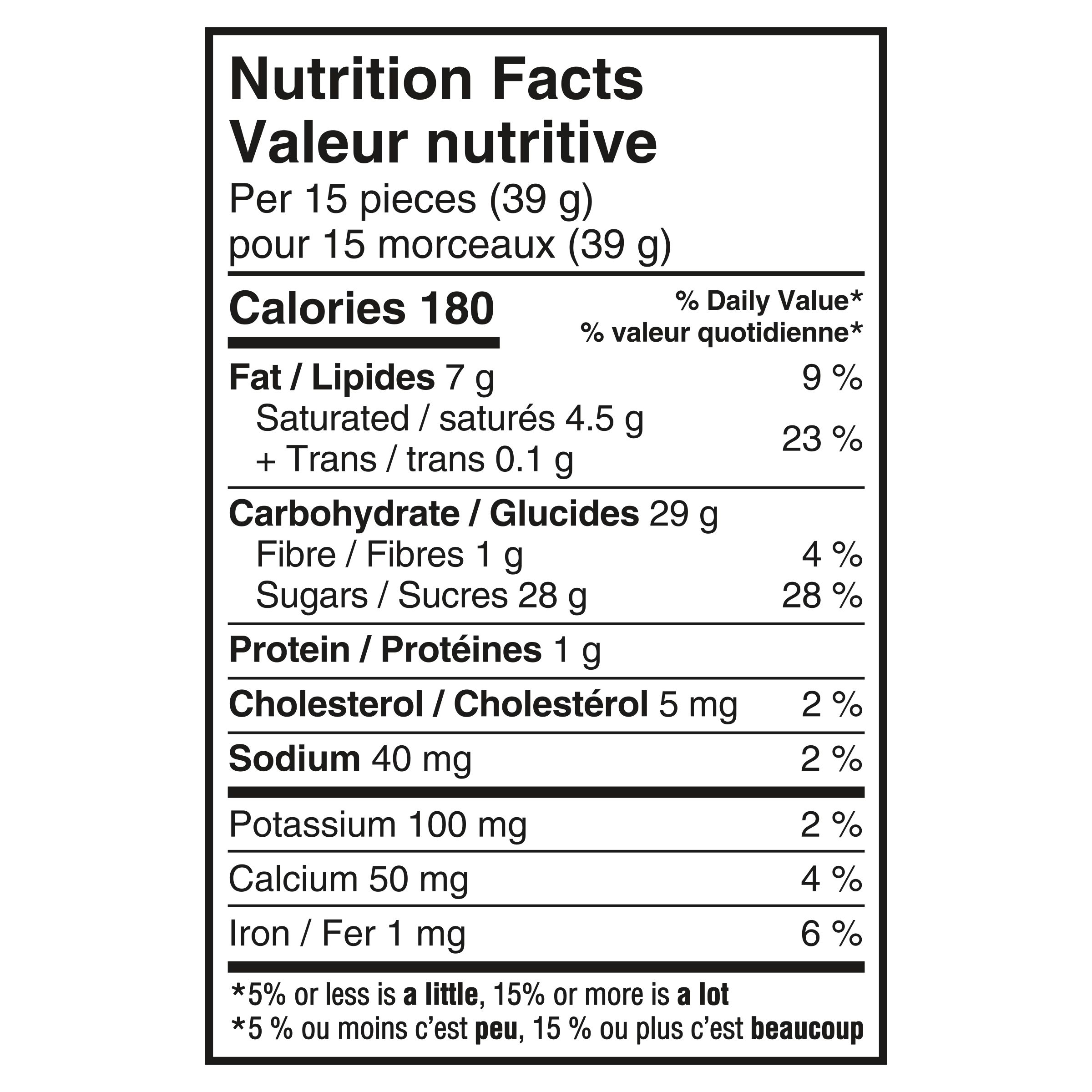 : Sucres (sucre, sirop de glucose), Substances laitières modifiées, Beurre de cacao, Chocolat non sucré, Huiles de palme et végétale modifiées, Lécithine de soja, Gomme arabique, Cire dabeille, Arômes naturels et artificiels, Dioxyde de titane, Tartrazine, Rouge allura, Bleu brillant FCF. Contient : Lait, Soja.
