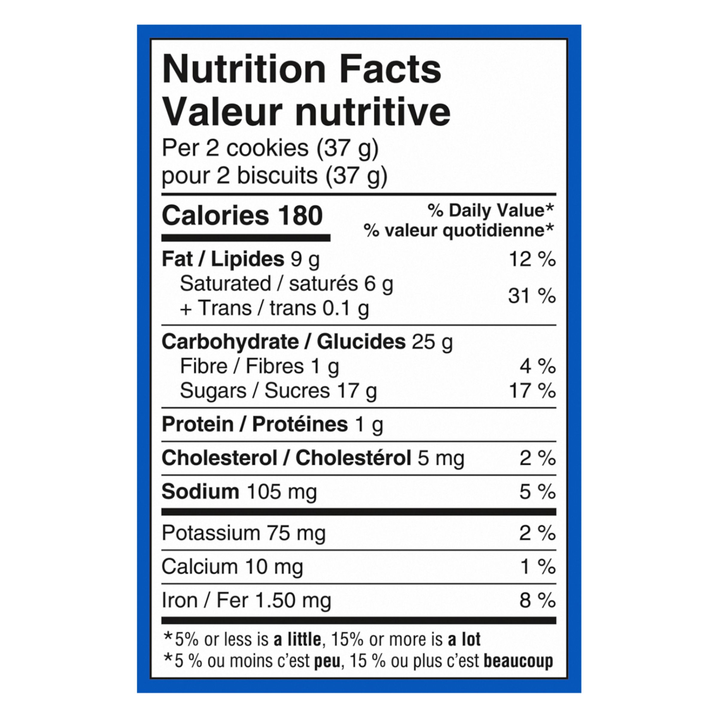 Sucres (sucre et/ou sucre doré, glucose-fructose), Farine de blé, Huiles de palme et de palmiste modifiées, Huile de palme modifiée, Cacao, Huile végétale, Substances laitières, Amidon(s) de blé et/ou de maïs, Lécithine de soja, Sel, Bicarbonate de sodium, Chocolat non sucré, Arôme artificiel.Contient : Blé, Lait, Soja.