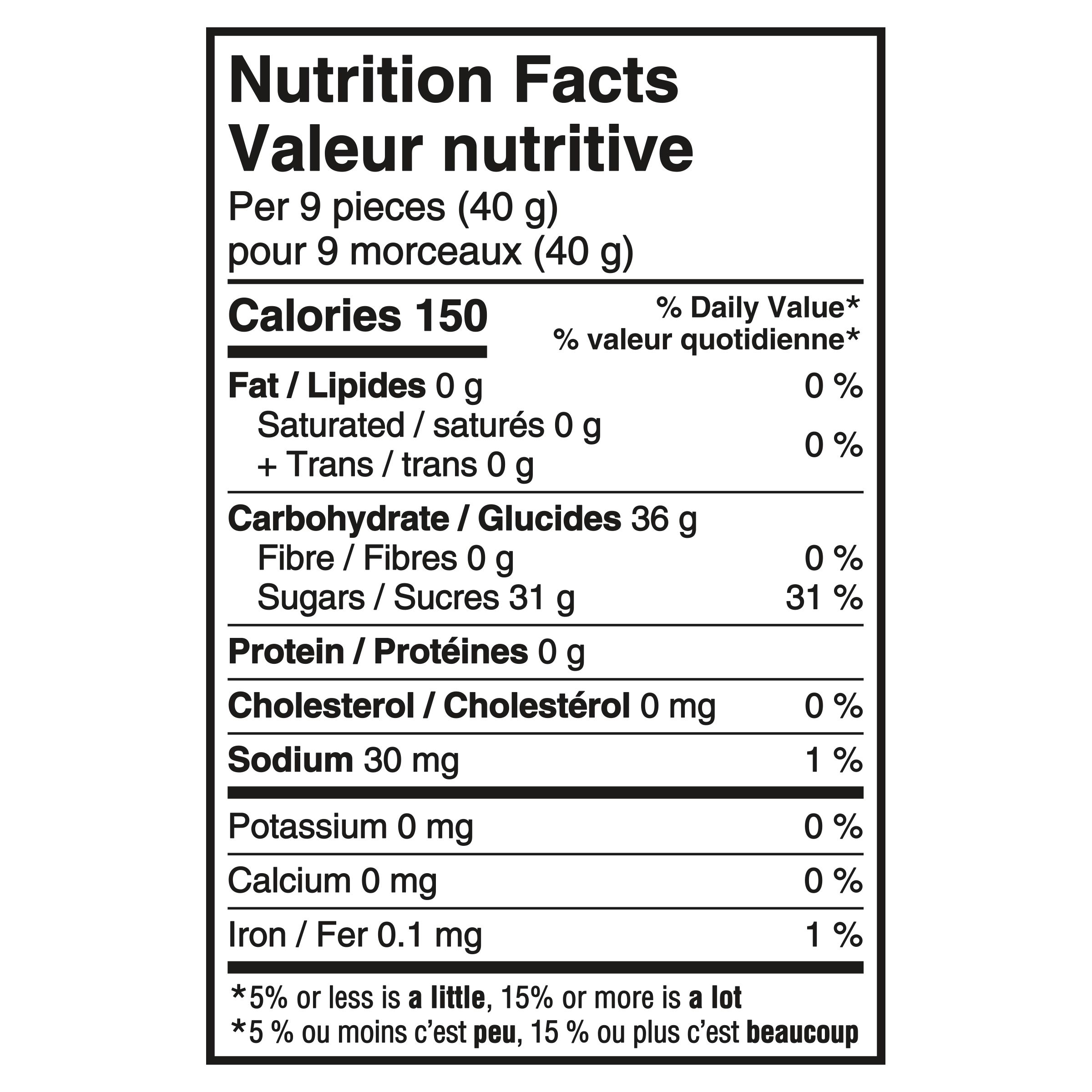 Sugars (sugar, glucose syrup), Modified corn starch, Tartaric acid, Citric acid, Artificial flavour, Allura red, Tartrazine, Brilliant blue FCF.