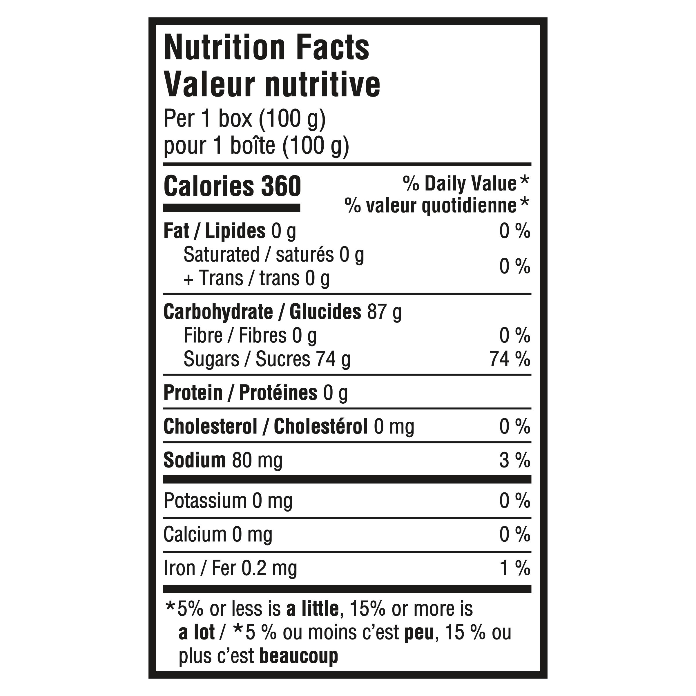 Sugars (sugar, glucose syrup), Modified corn starch, Fumaric acid, Citric acid, Malic acid, Tartaric acid, Artificial flavour, Allura red, Brilliant blue FCF, Sunset yellow FCF, Tartrazine.