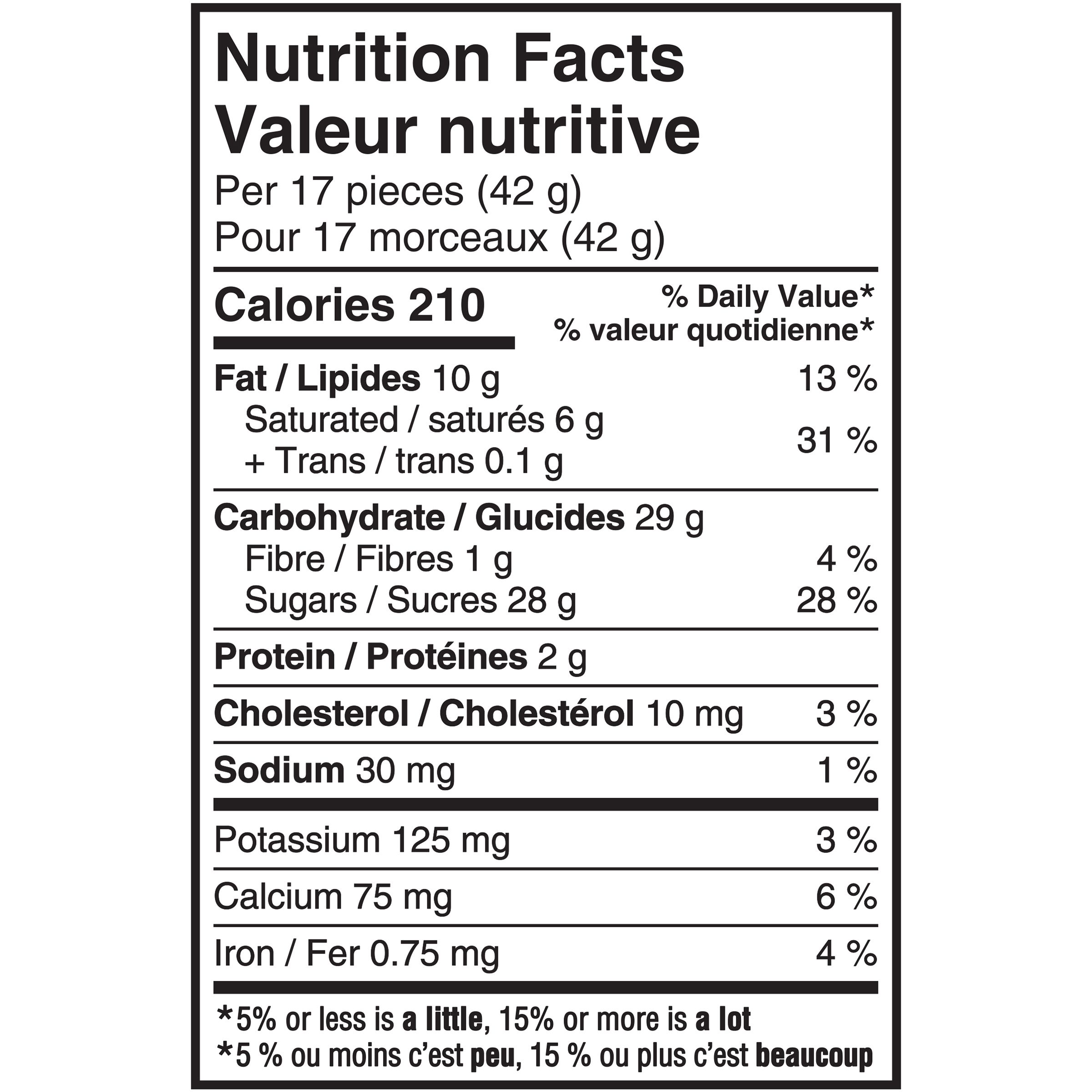 Sugar, Milk ingredients, Modified palm and modified vegetable oil, Unsweetened chocolate, Cocoa butter, Soy lecithin, Gum Arabic, Natural and artificial flavours, Titanium dioxide, Tartrazine, Brilliant blue FCF, Allura red. Contains: Milk, Soy. May contain: Peanut, Almond, Cashew, Hazelnut.