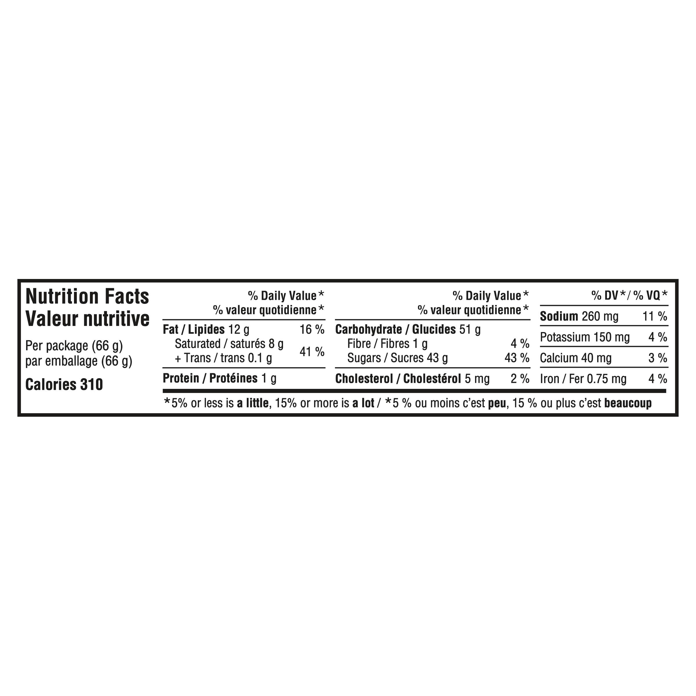 Sugars (sugar, glucose syrup), Modified palm oil, Modified milk ingredients, Modified vegetable oil, Cocoa, Unsweetened chocolate, Salt, Baking soda, Soy lecithin, Calcium chloride, Natural and artificial flavour. Contains: Milk, Soy. May contain: Peanut, Tree nuts.