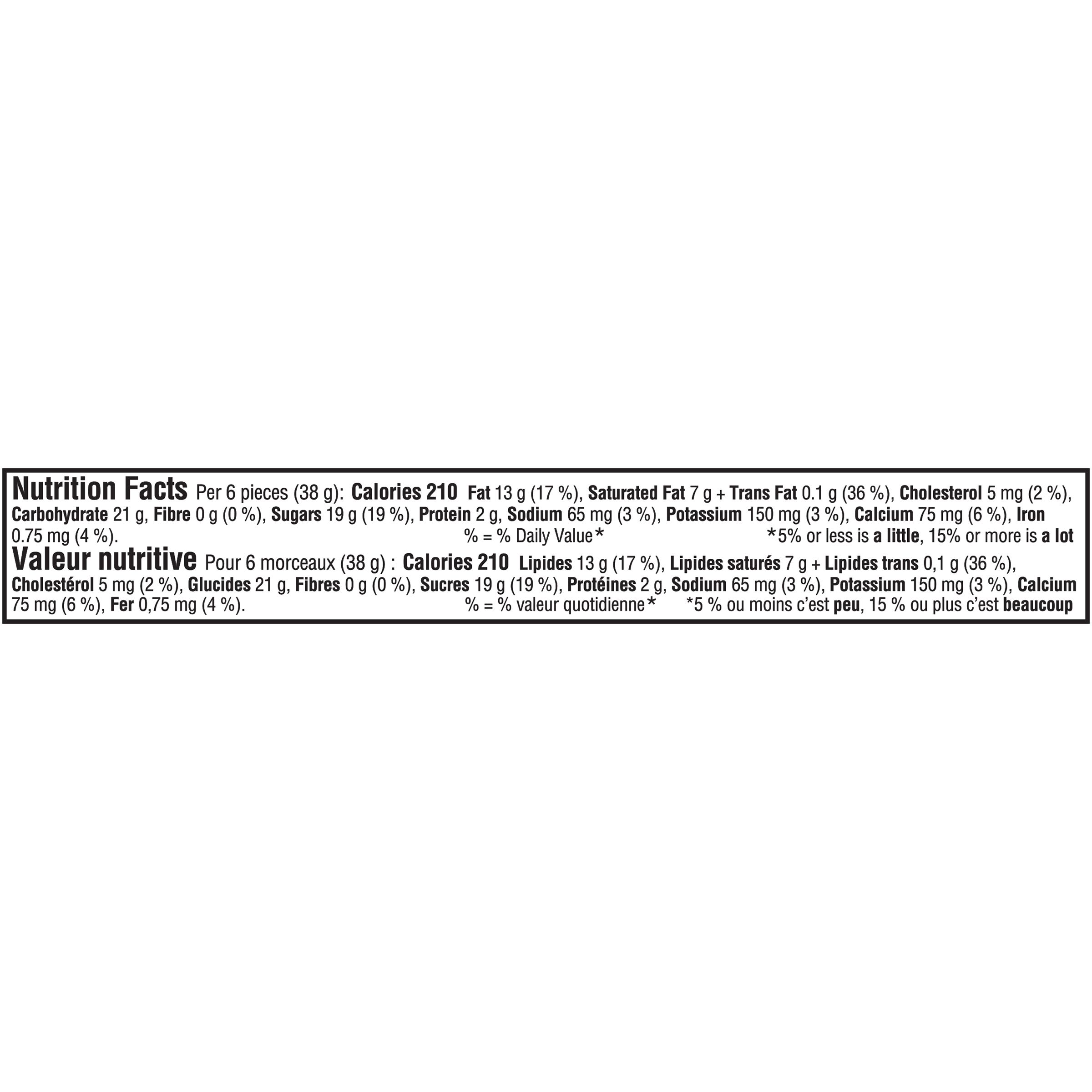 Sugars (sugar, glucose syrup), Modified milk ingredients, Modified palm oil, Wheat flour, Unsweetened chocolate, Cocoa butter, Modified vegetable oil, Cocoa, Salt, Ammonium phosphatides, Polyglycerol polyricinoleate, Soy lecithin, Ammonium bicarbonate, Baking soda, Artificial flavour. Contains: Milk, Wheat, Soy. May contain: Tree nuts.