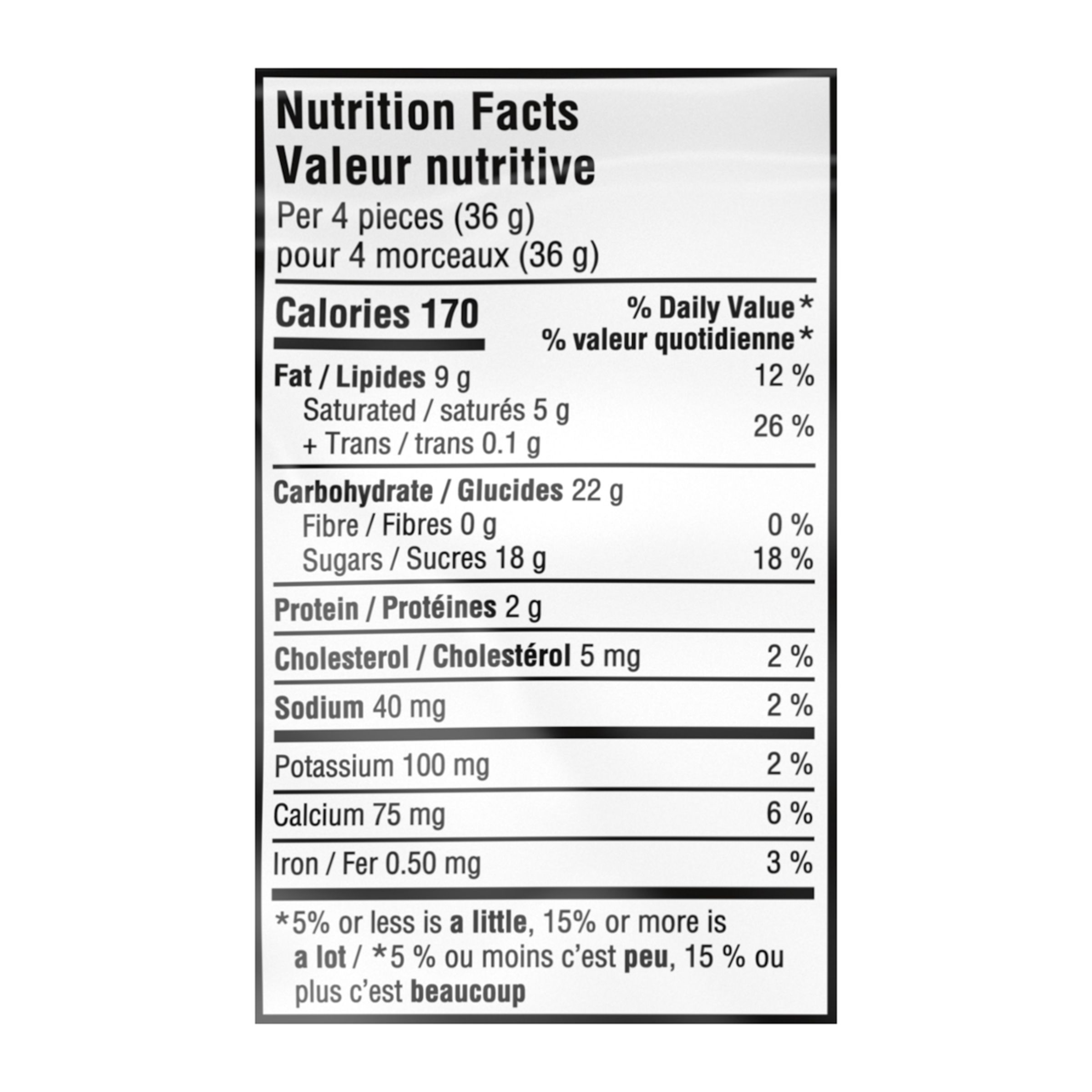 Sugars (sugar, glucose syrup), Milk ingredients, Modified palm oil, Unsweetened chocolate, Palm oil, Modified vegetable oil, Cocoa butter, Salt, Soy lecithin, Baking soda, Calcium chloride, Natural and artificial flavour. Contains: Milk, Soy. May contain: Egg, Peanut, Tree nuts.