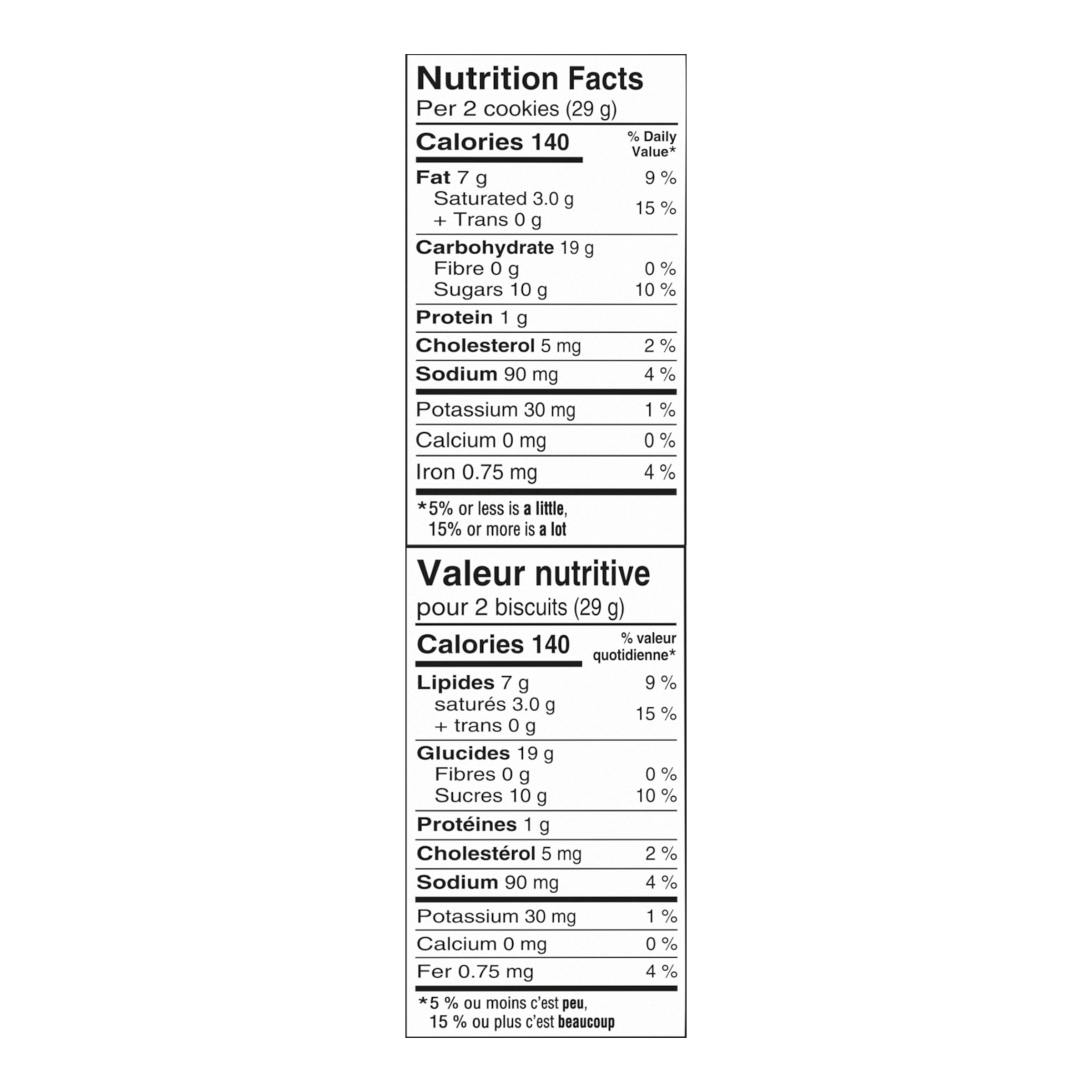 Wheat flour, Rainbow chips (sugar, hydrogenated palm kernel oil, cocoa powder, dextrose, modified milk ingredients, titanium dioxide, tartrazine, brilliant blue FCF, carnauba wax, allura red, shellac, soy lecithin, bees wax, erythrosine, indigotine), Shortening (vegetable oil, modified palm oil and/or modified palm kernel oil), Sugars (sugar and/or golden sugar, glucose-fructose), Semi-sweet chocolate chips (sugar, unsweetened chocolate, cocoa butter, dextrose, milk ingredients, soy lecithin), Modified milk ingredients, Baking soda, Salt, Ammonium bicarbonate, Artificial flavour.Contains: Wheat, Milk, Soy.