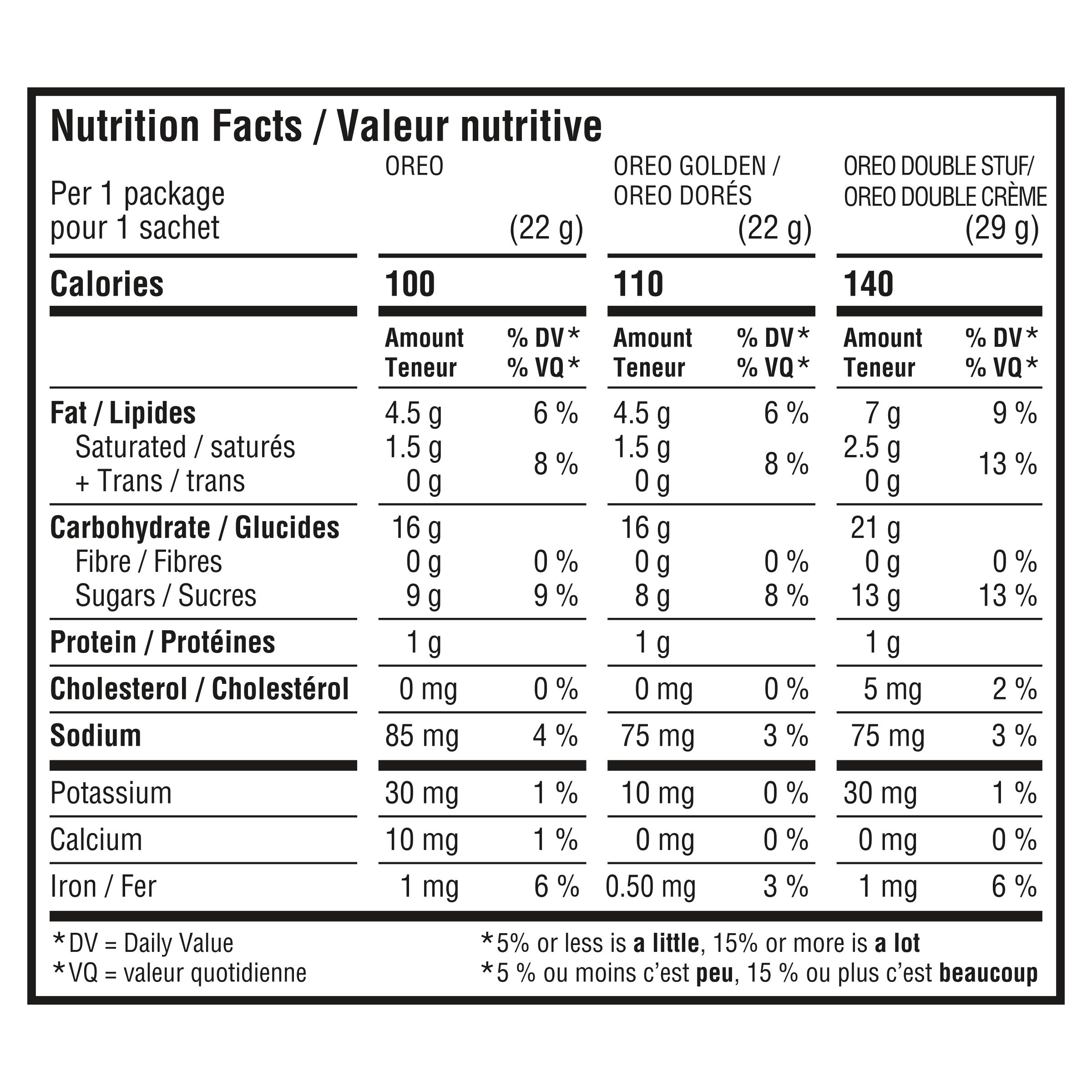 Ingredients: Sugars (sugar and/or golden sugar, glucose-fructose), Wheat flour, Modified palm oil, Vegetable oil, Cocoa, Corn starch, Baking soda, Salt, Soy lecithin, Monocalcium phosphate, Unsweetened chocolate, Artificial flavour. Contains: Wheat, Soy. OREO GOLDEN / OREO DORÉS Ingredients: Wheat flour, Sugars (sugar and/or golden sugar, glucose-fructose), Vegetable oil, Modified palm oil, Corn starch, Salt, Baking soda, Soy lecithin, Artificial flavour. Contains: Wheat, Soy. OREO DOUBLE STUF / OREO DOUBLE CRÈME Ingredients: Sugars (sugar, glucose-fructose), Wheat flour, Modified palm oil, Vegetable oil, Cocoa, Wheat and/or Corn starch, Salt, Soy lecithin, Baking soda, Ammonium bicarbonate, Unsweetened chocolate, Artificial flavour. Contains: Wheat, Soy.