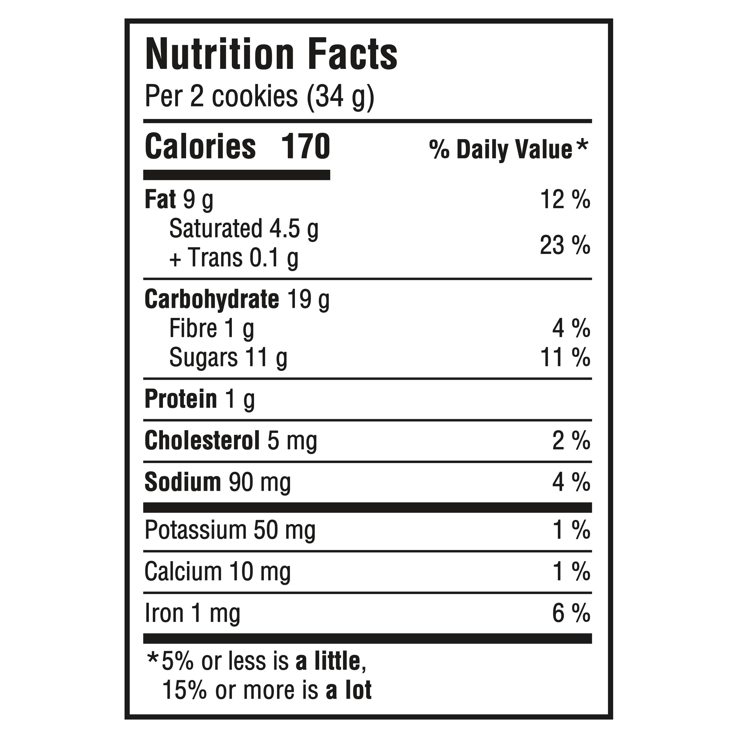 Wheat flour, Caramel chips (sugar, cocoa butter, milk ingredients, palm kernel oil, unsweetened chocolate, hydrogenated palm oil, natural flavour, soy lecithin, sea salt, cocoa, paprika extract), Shortening (vegetable oil, modified palm oil), Sugars (sugar and/or golden sugar, fancy molasses, glucose-fructose), Semi-sweet chocolate chips (sugar, unsweetened chocolate, cocoa butter, dextrose, milk ingredients, soy lecithin), Confectionery drops (sugar, palm kernel oil and palm oil, modified milk ingredients, dextrose, soy lecithin, salt, artificial flavour, sunset yellow FCF, tartrazine, indigotine), Baking soda, Modified milk ingredients, Salt, Ammonium bicarbonate, Ammonium phosphate, Soy lecithin, Asparaginase, Artificial flavour, Caramel colour.Contains: Milk, Wheat, Soy.