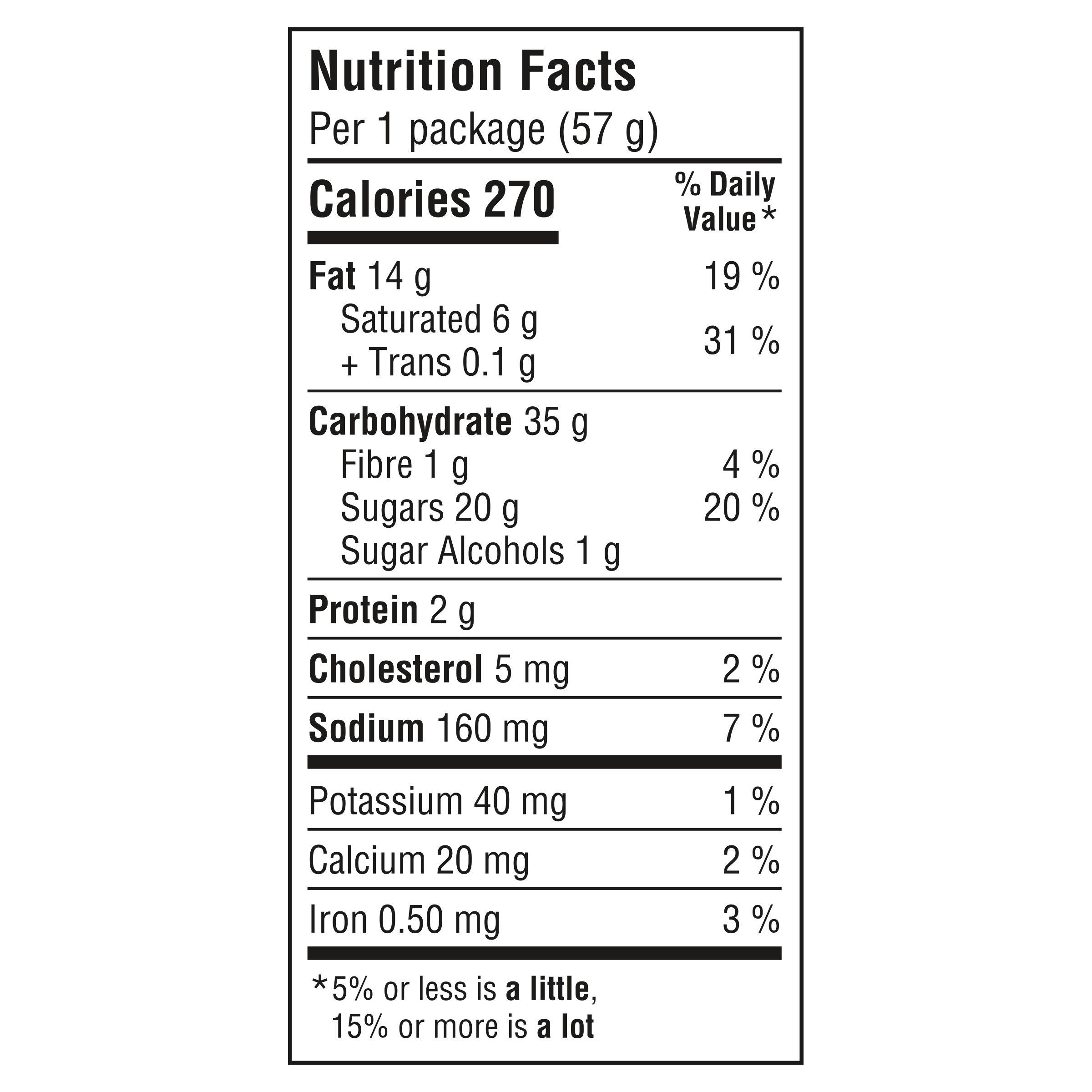 Sugars (icing sugar, sugar, fructose, dextrose, glucose syrup), Wheat flour, Modified palm oil, Corn starch, Water, Vegetable oil, Polydextrose, Milk ingredients, Salt, Dried egg-white, Whole dried egg, Modified corn starch, Corn flour, Baking powder, Baking soda, Propylene glycol esters of fatty acids, Soy lecithin, Mono-glycerides, Xanthan gum, Sodium stearoyl-lactate, Tricalcium phosphate, Malic acid, Sodium alginate, Sodium phosphate, Natural and artificial flavour, Caramel colour.Contains: Egg, Milk, Wheat, Soy.May contain: Peanut, Almond.