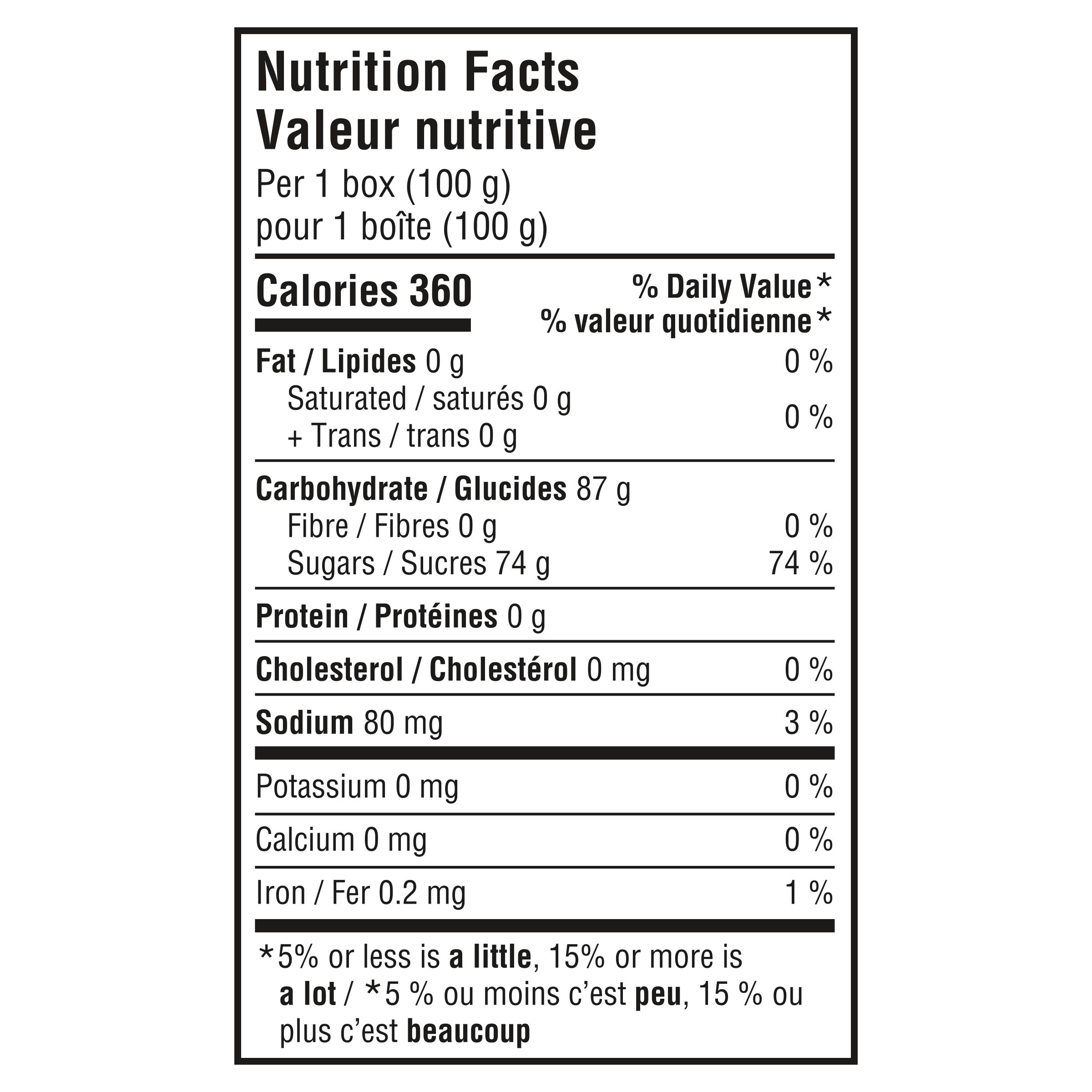 : Sucres (sucre, sirop de glucose), Amidon de maïs modifié, Acide fumarique, Acide citrique, Acide malique, Acide tartrique, Arôme artificiel, Rouge allura, Bleu brillant FCF, Jaune soleil FCF, Tartrazine.